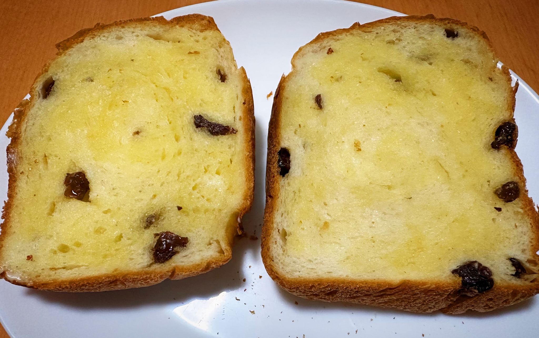 自家製レーズンでパンを作り、そのパンを焼いてバターを塗って食べました。おっ美味しい!!😳